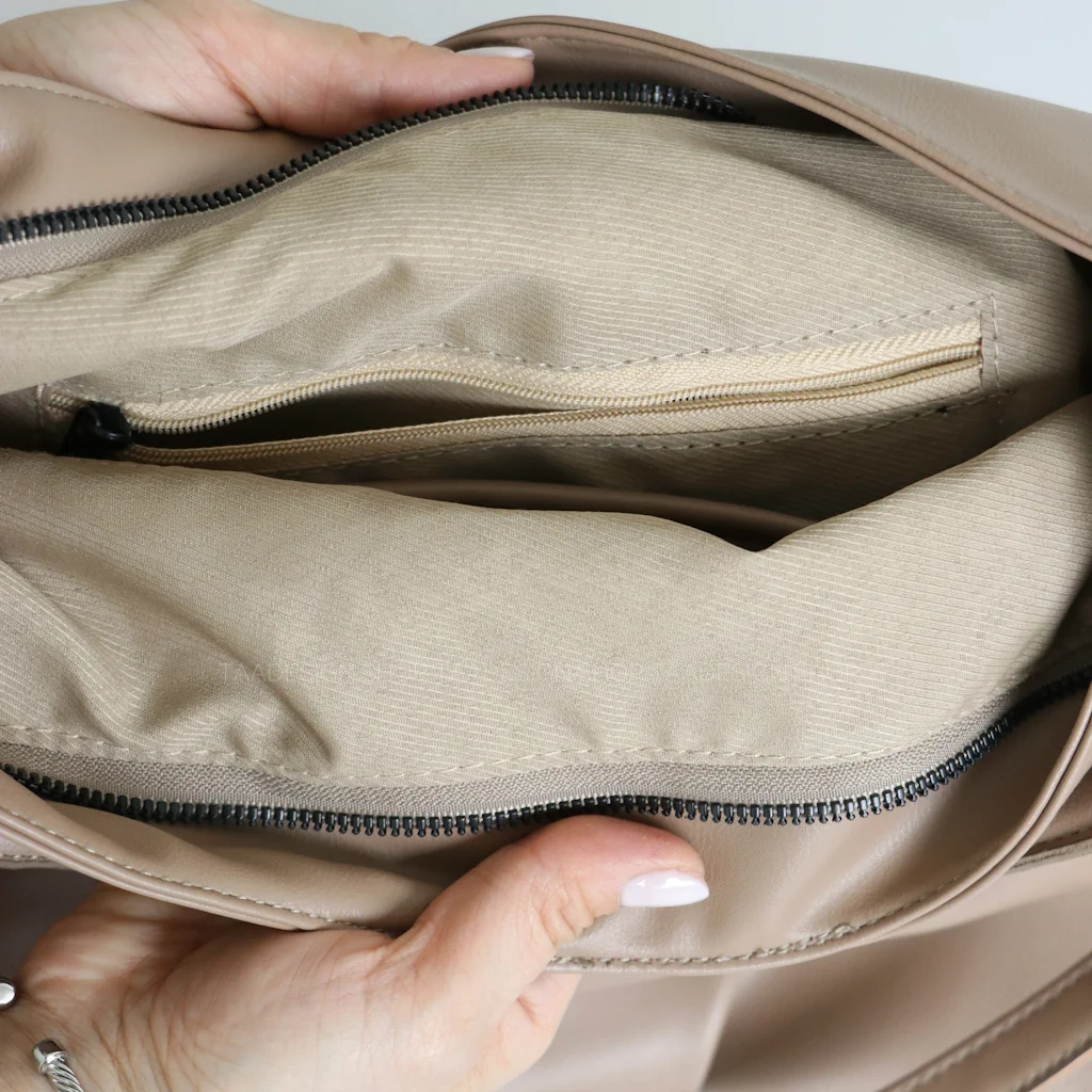 - فضای داخل و بیرون کیف: دارای یک فضای کلی بهمراه زیپ و داخل کیف دارای دو جیب و یک جیب بهمراه زیپ میباشد.