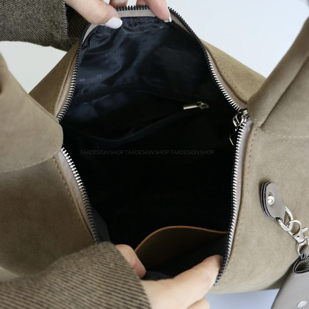 - فضای داخل و بیرون کیف: دارای یک فضای کلی بهمراه زیپ و داخل کیف دارای دو جیب و یک جیب بهمراه زیپ و پشت کیف دارای یک جیب بهمراه زیپ و دارای آویز کیف پول خرد میباشد.
