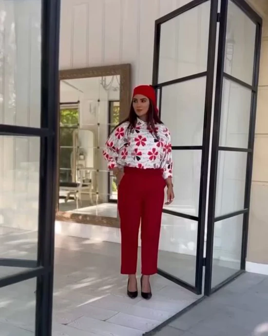 بلوز و شلوار به رنگ قرمز و سبز یا در ترکیب با سفید و مشکی استایل ساده و جذابی برای شب یلداست که می توانید با کیف های دوشی، شال و روسری و زیورآلات طلایی و یلدایی آن را تکمیل کنید.